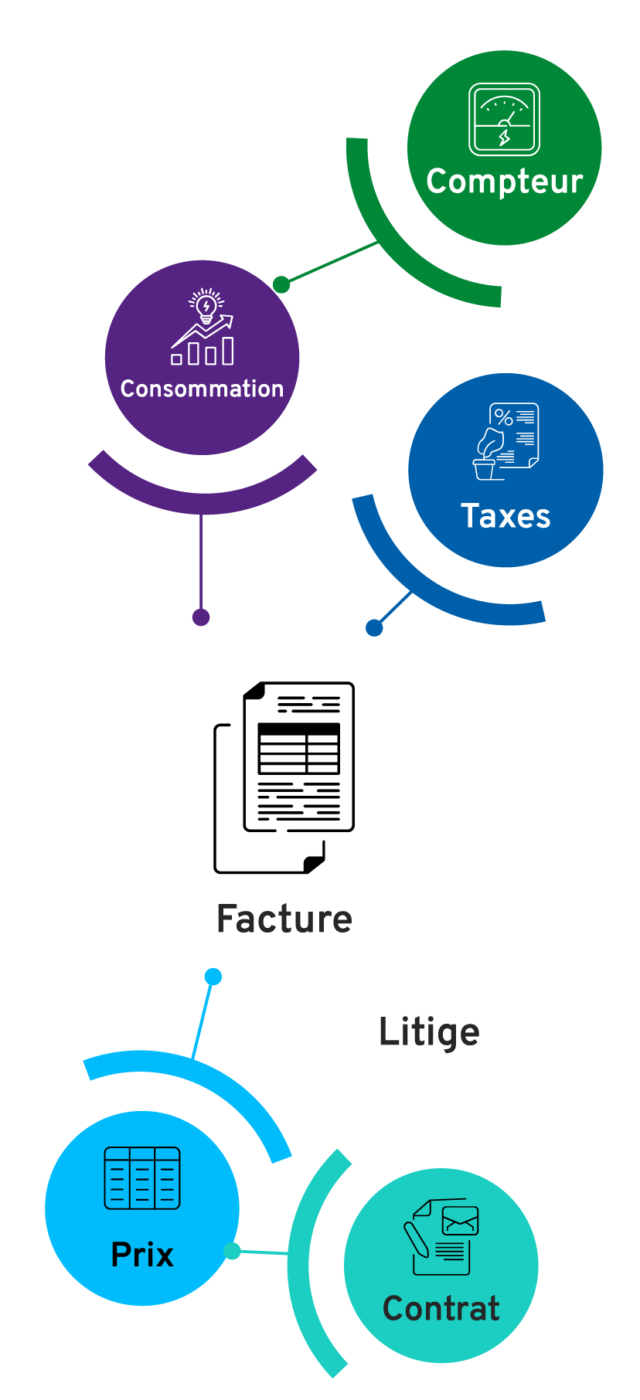 Cliquez sur les différents éléments qui composent votre facture pour en savoir plus et découvrir ce qui peut mener à un litige.